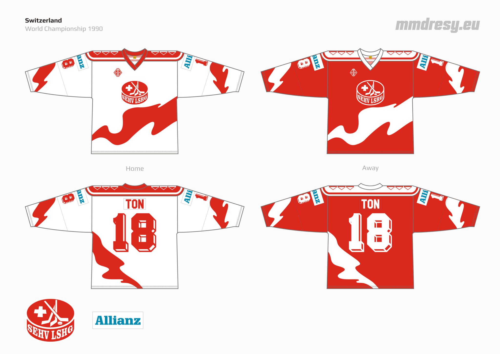 1990 spielt die Schweiz zum zweiten Mal in diesem Tackla-Design mit der geschwungenen Linie unterhalb des SEHV-Logos. 1990 ist das Aufstiegsjahr der Schweiz, ein Jahr zu spät für die Heim-Weltmeisterschaft aber dennoch der Startschuss zur kurzfristigen Etablierung von drei Jahren in der A-Gruppe.